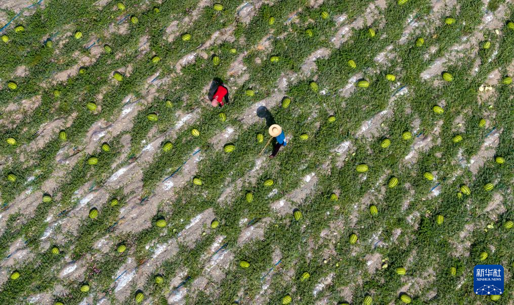7月20日,农户在中卫市沙坡头区香山乡硒砂瓜田里劳作(无人机照片)。