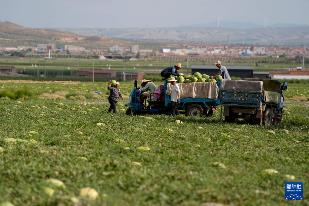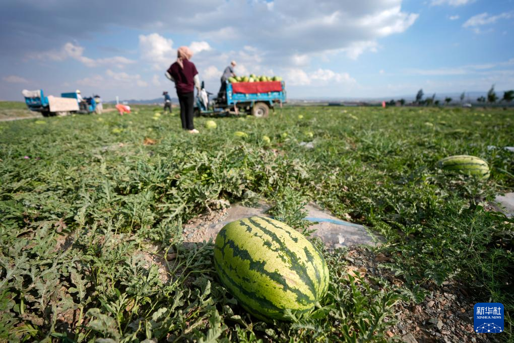 7月20日,农户在中卫市沙坡头区兴仁镇采摘、转运硒砂瓜。