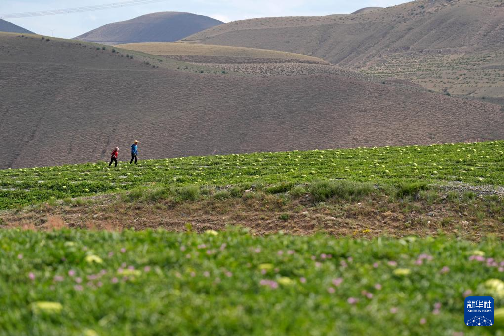 7月20日,农户在中卫市沙坡头区香山乡硒砂瓜田里劳作。