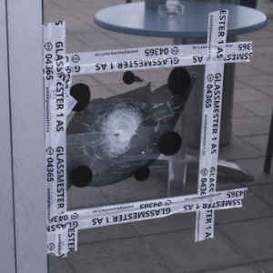 这是7月20日在挪威首都奥斯陆特韦塔购物中心拍摄的一处玻璃门上留下的弹孔。