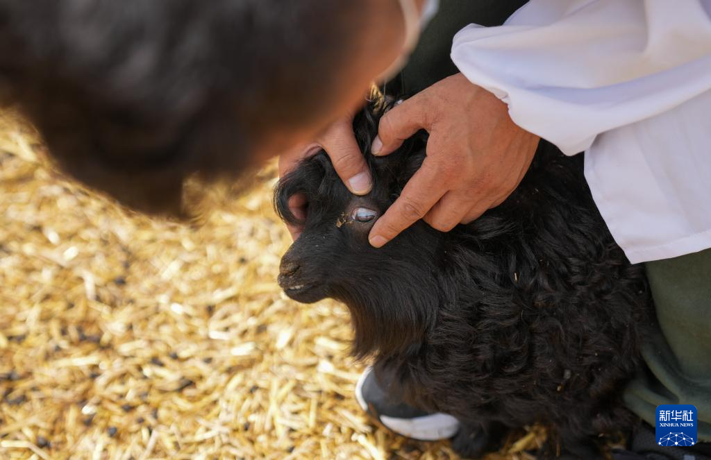 边坝县黑山羊养殖基地的工作人员在检查黑山羊羊羔健康状况(7月20日摄)。