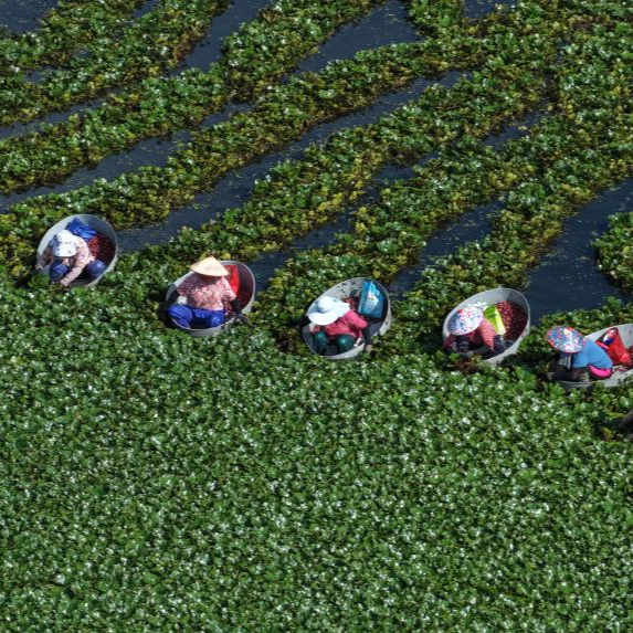 7月21日,村民在江苏省泰州市海陵区苏陈镇张家院社区采摘菱角(无人机照片)。