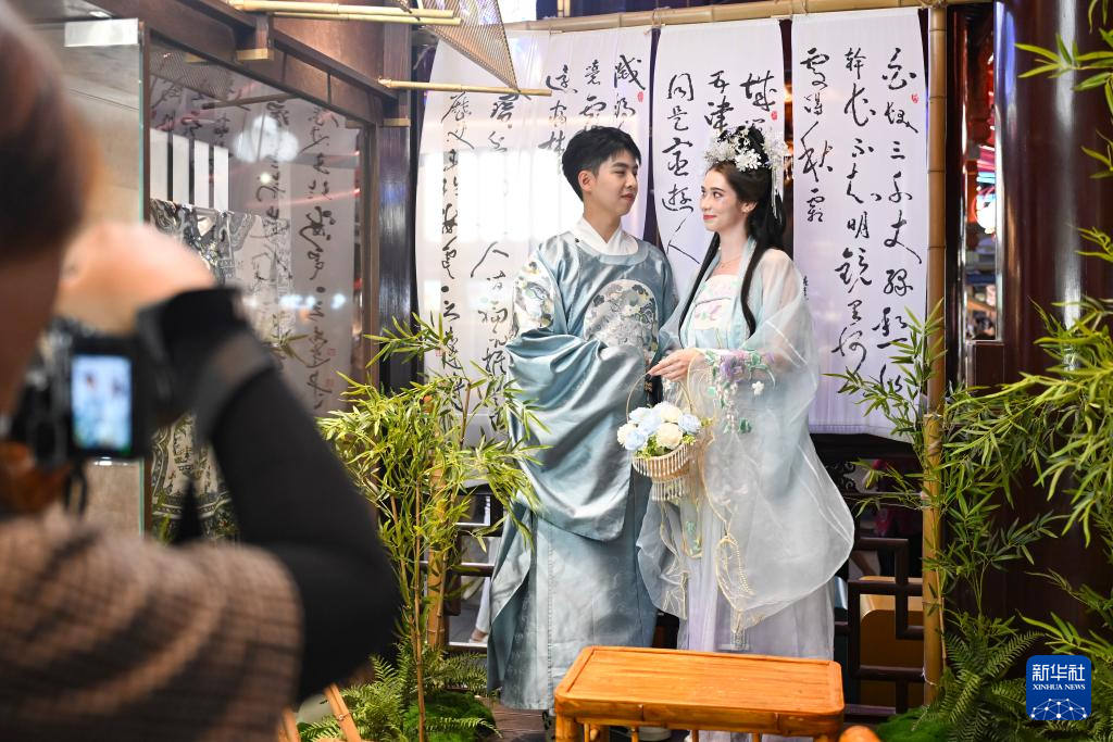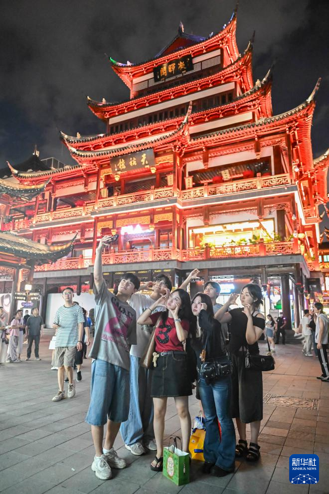 7月21日晚,奥地利游客在上海豫园商城拍摄汉服写真。