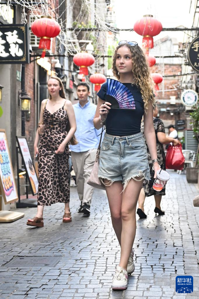 7月21日,俄罗斯游客索尼娅·布里亚克(右)行走在上海市田子坊。