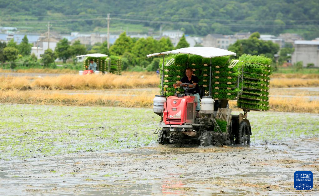 7月22日,浙江省温岭市城南镇东峰山村农民驾驶插秧机插种晚稻秧苗。