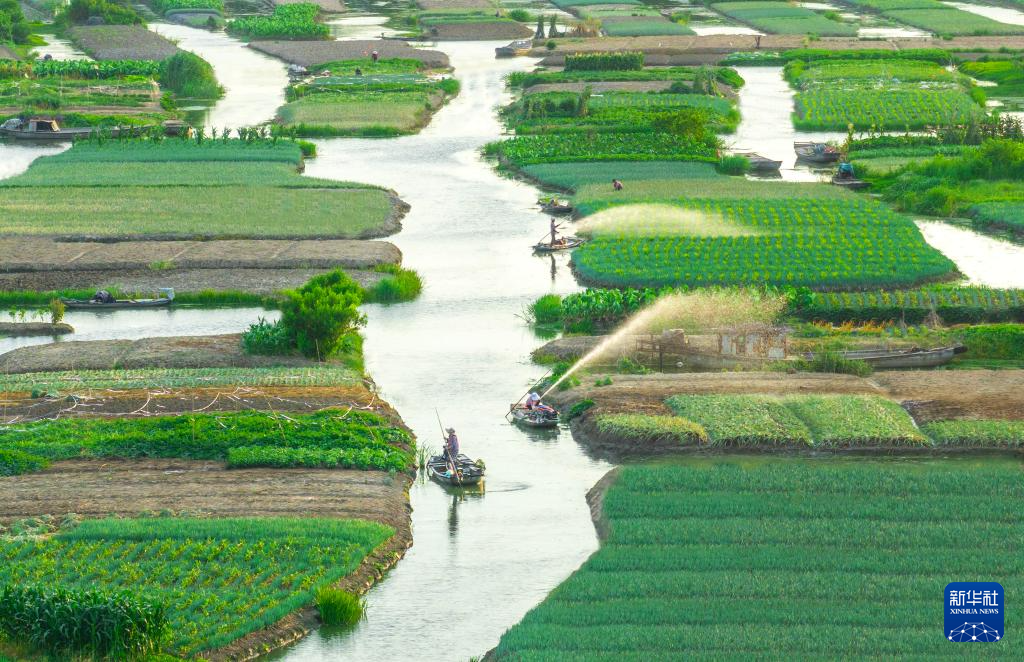 7月22日,农民在江苏省昆山市巴城镇一处有机种植基地劳作(无人机照片)。
