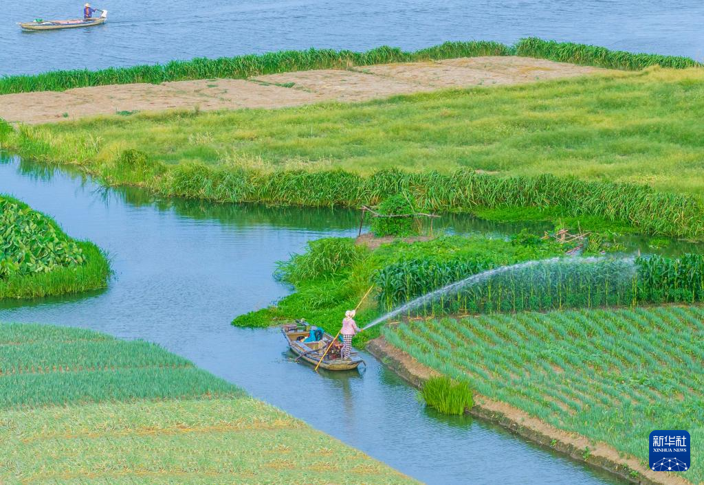 7月22日,农民在江苏省兴化市垛田街道高家荡村的田间浇水(无人机照片)。