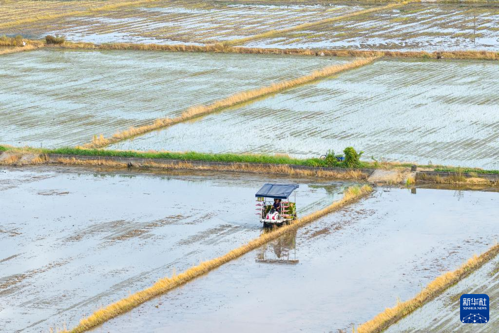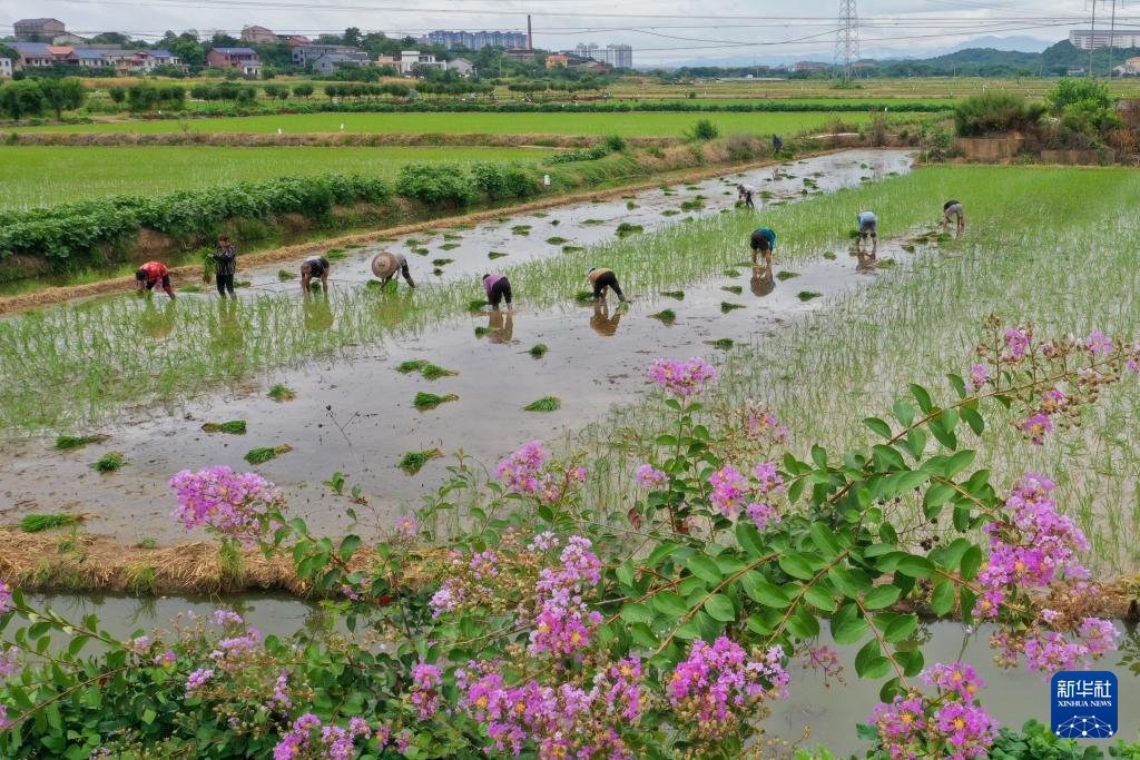 7月22日,农民在湖南省衡阳市衡阳县西渡镇青里村栽插晚稻秧苗(无人机照片)。