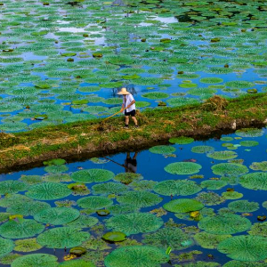 7月22日,农民在江苏省兴化市垛田街道高家荡村的田间劳作(无人机照片)。
