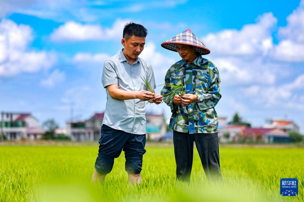 7月22日,农技人员和农民在江苏省南通市通州区东社镇严北村的田间查看水稻生长情况。