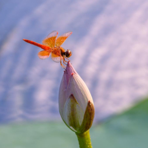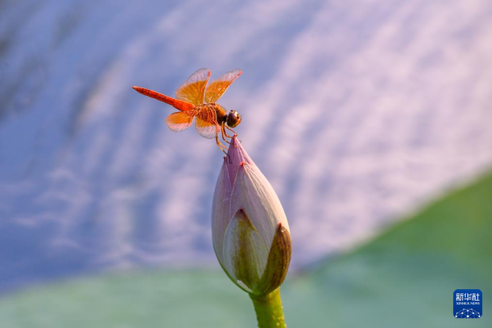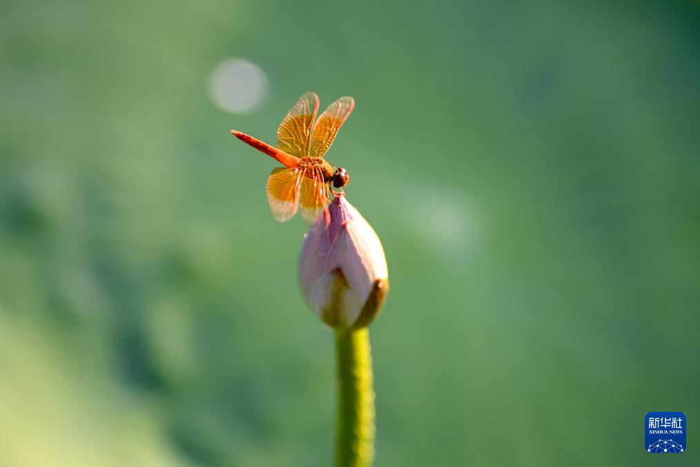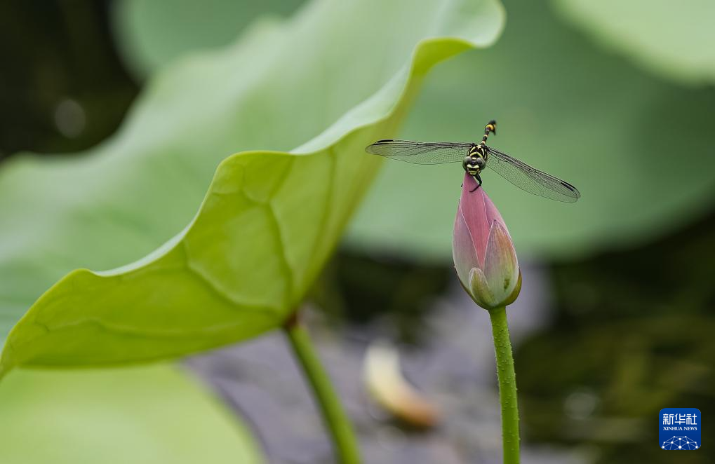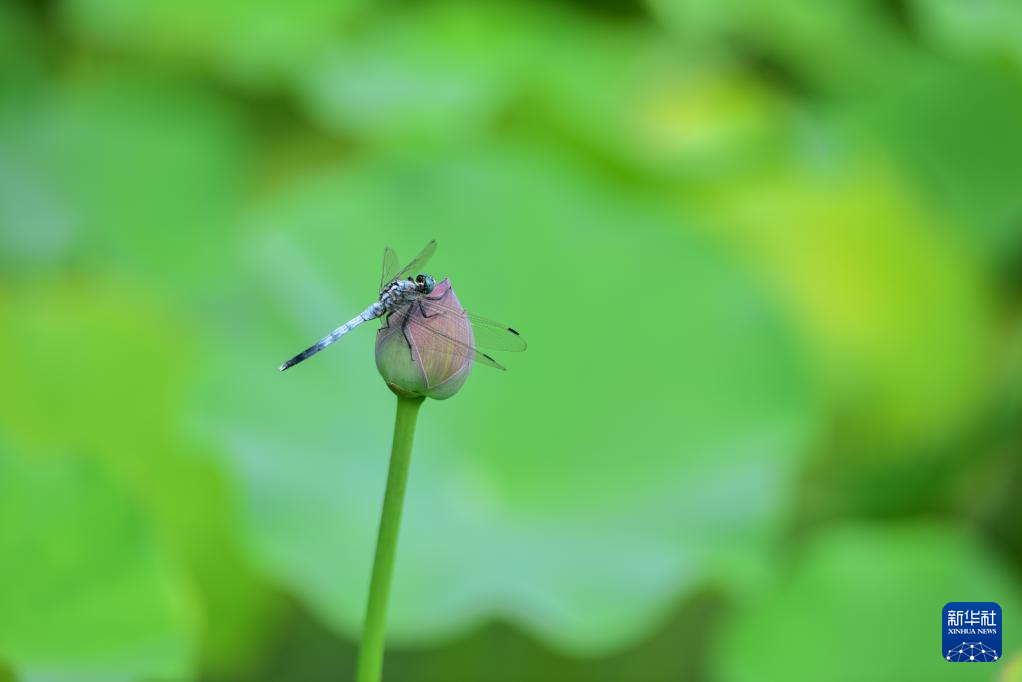 7月22日,在江苏省南京市玄武湖公园,一只蜻蜓在荷花花苞上停留。