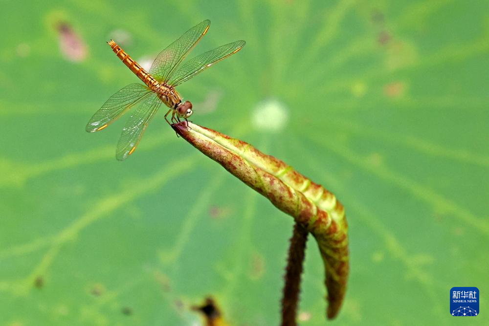 7月22日,在山东省枣庄市东湖公园荷花池,一只蜻蜓停在荷叶上。