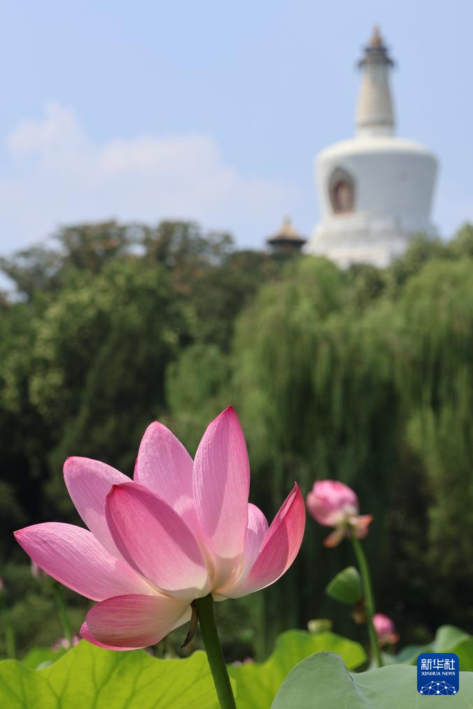 7月22日,北京北海公园盛开的荷花映衬着白塔。