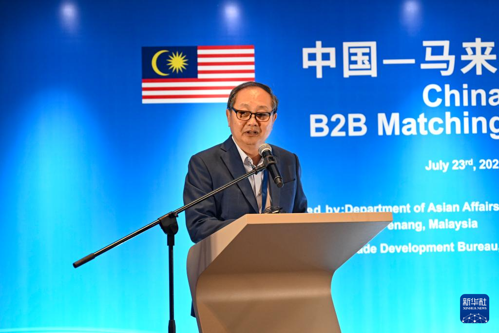 7月23日,在马来西亚槟城,马来西亚厂商联合会槟城分会主席李忠利在中国-马来西亚电子行业对接会暨宣介会上致辞。