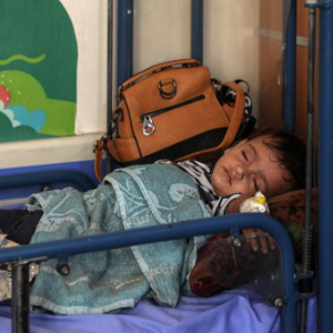 7月23日,在加沙城一所医院里,一名女子照顾营养不良的儿童。