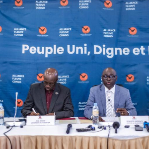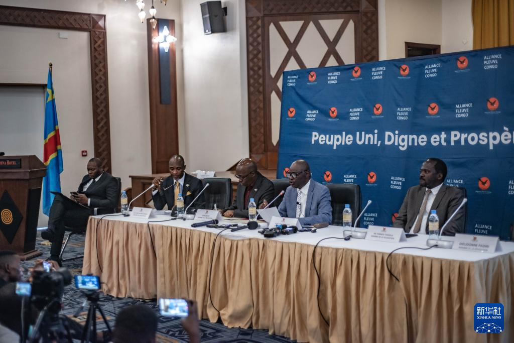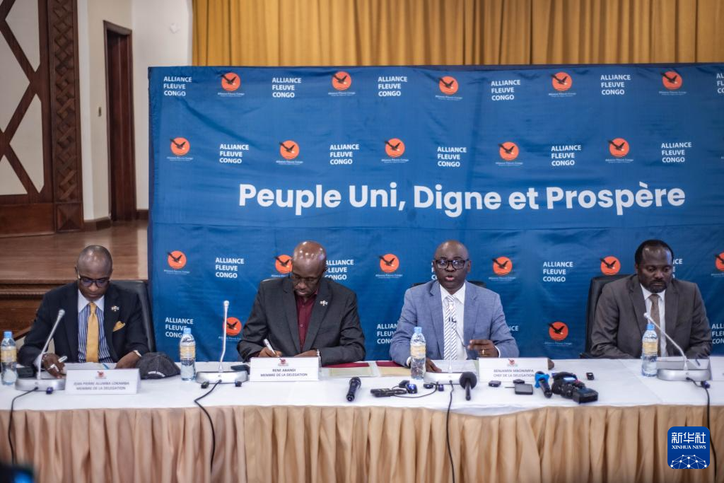 7月25日,在刚果(金)北基伍省首府戈马市,“M23运动”对话代表姆博宁帕(右二)出席记者会。