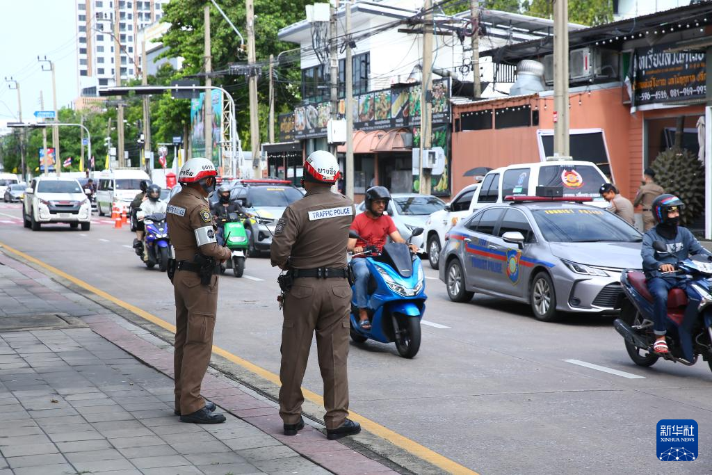 7月28日,在泰国曼谷,交警在枪击事件现场附近指挥交通。