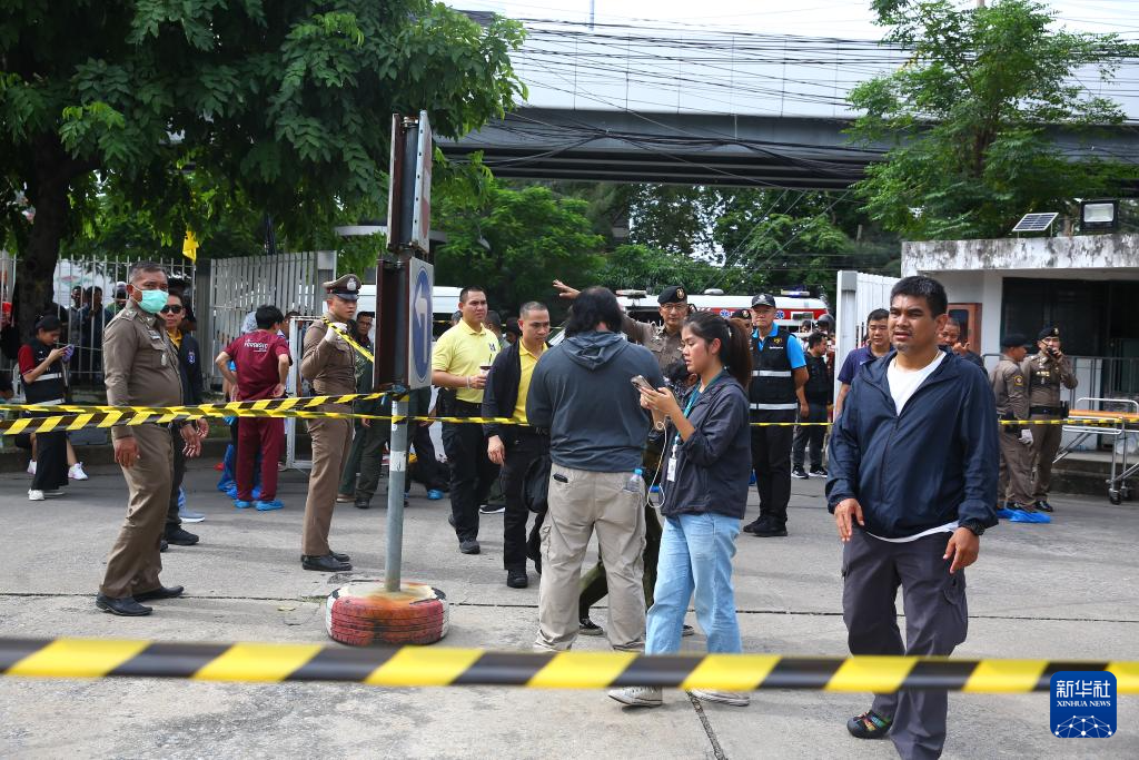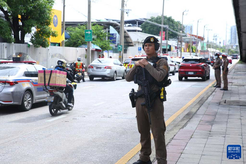 7月28日,在泰国曼谷,安全人员在枪击事件现场附近警戒。