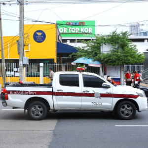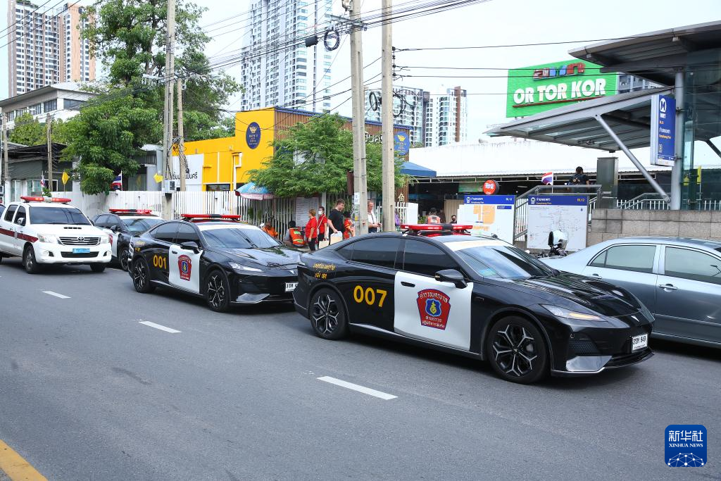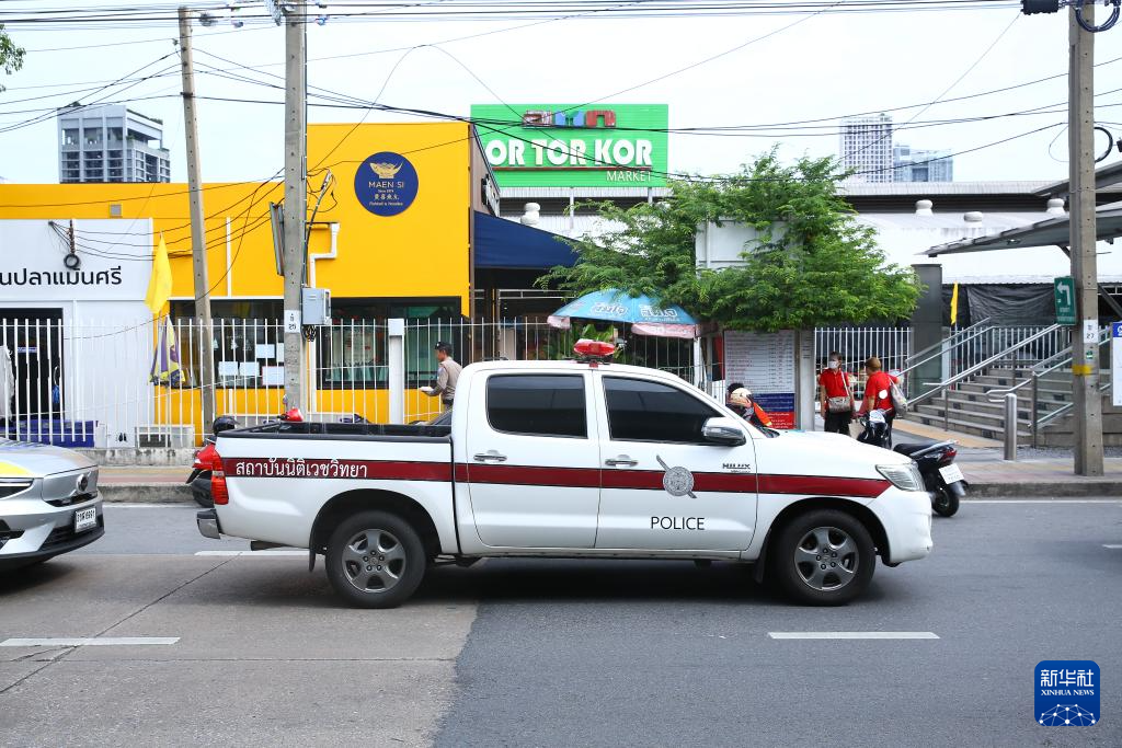 7月28日,在泰国曼谷,警车停在枪击事件现场附近。