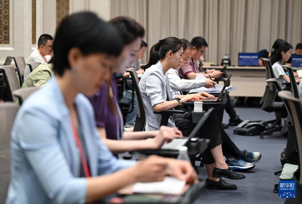 7月28日,国务院新闻办公室举行“高质量完成‘十四五’规划”系列主题新闻发布会,国家税务总局局长胡静林,税务总局副局长王道树,税务总局副局长蔡自力,税务总局总经济师兼新闻发言人荣海楼介绍“十四五”时期税收改革与发展有关情况,并答记者问。这是记者在发布会上工作。