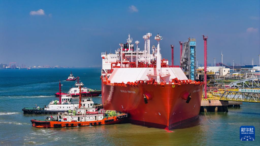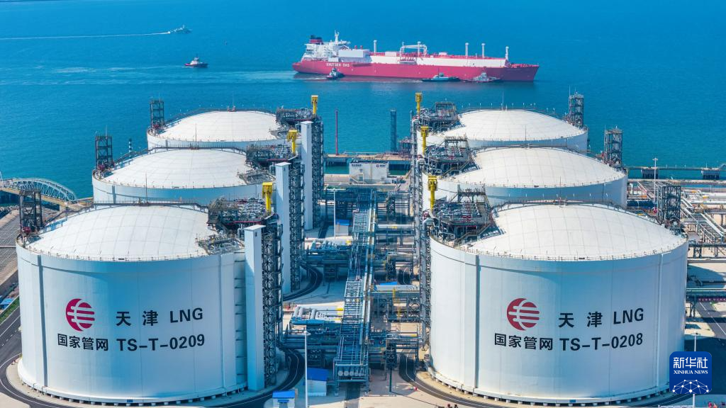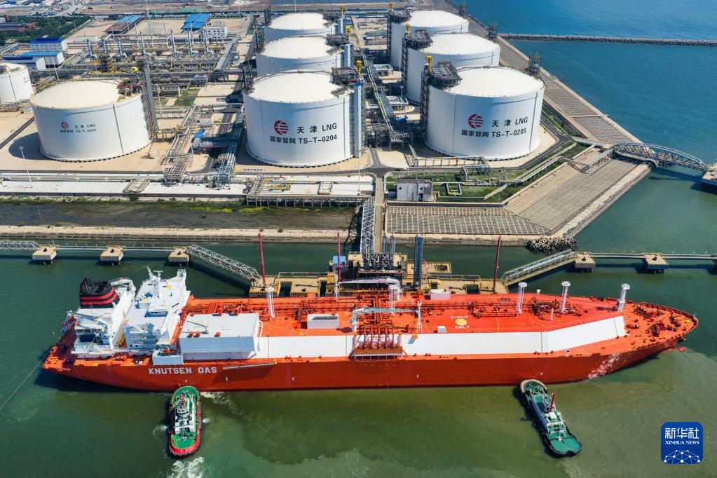 7月27日,一艘来自海外的LNG船舶在国家管网天津LNG接收站码头进行靠泊作业(无人机照片)。