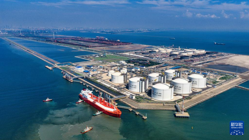 7月27日,一艘来自海外的LNG船舶在国家管网天津LNG接收站码头靠泊(无人机照片)。
