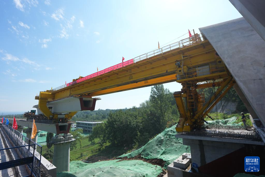 正在架设最后一孔箱梁的西康高铁跨关中环线立交特大桥(7月28日摄,无人机照片)。