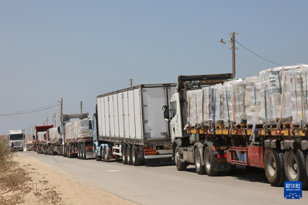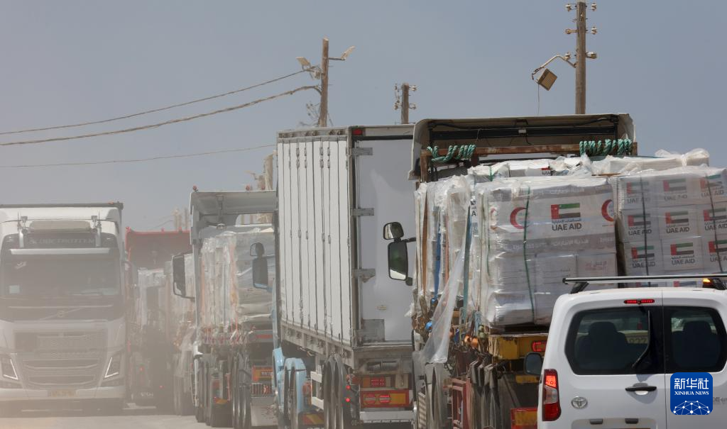 7月27日,在以色列与加沙地带边境以方一侧,载有人道主义物资的车辆排队进入加沙地带。