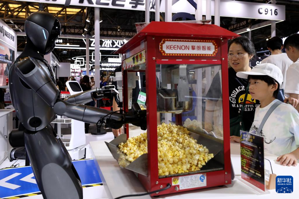 7月29日,参观者在一个机器人爆米花摊位前驻足观看。