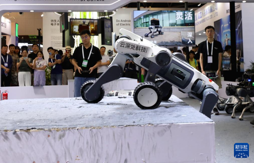 7月29日,参观者在国家电网展区观赏一款用于巡检工作的机器狗。