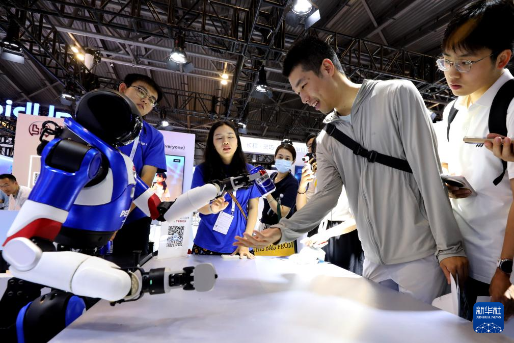 7月29日,参观者在近距离与一款装备智能灵巧手的机器人互动。