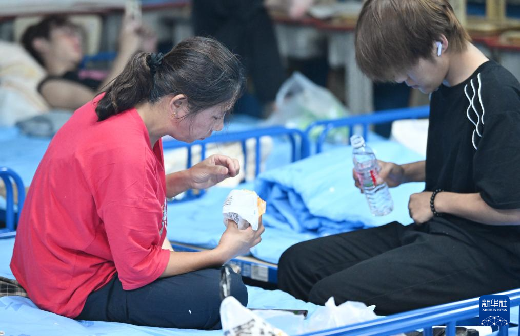 7月28日,集中安置群众在天津市蓟州区下营镇初级中学吃泡面。
