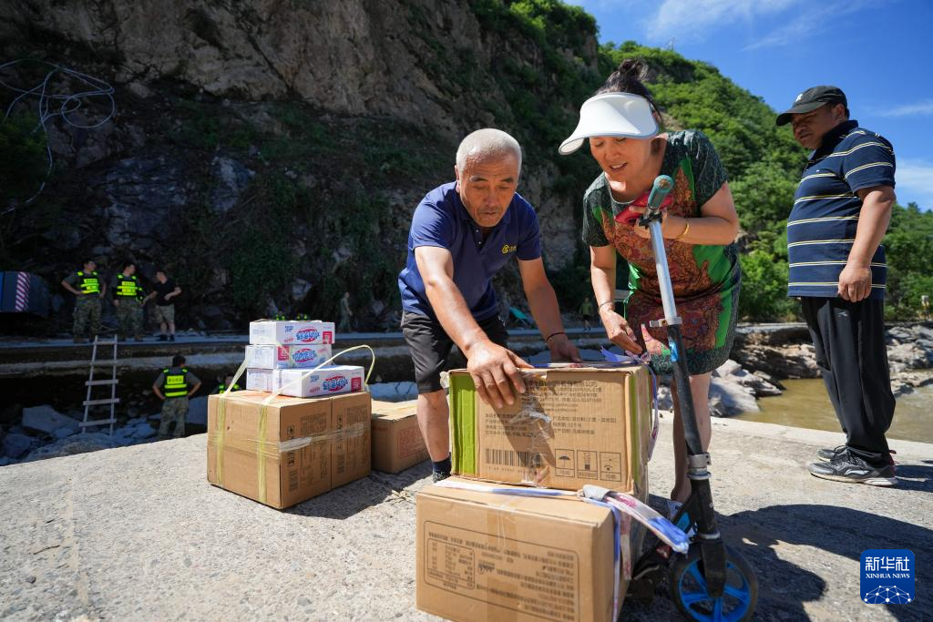 7月30日,在密云区冯家峪镇三岔口村,救援人员为村民运送生活物资。