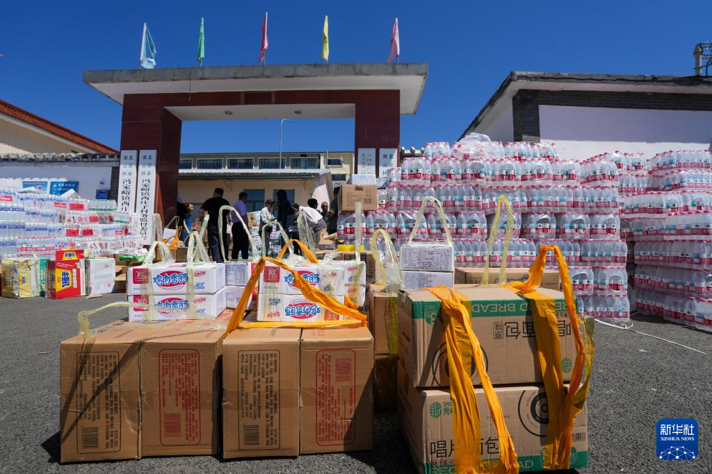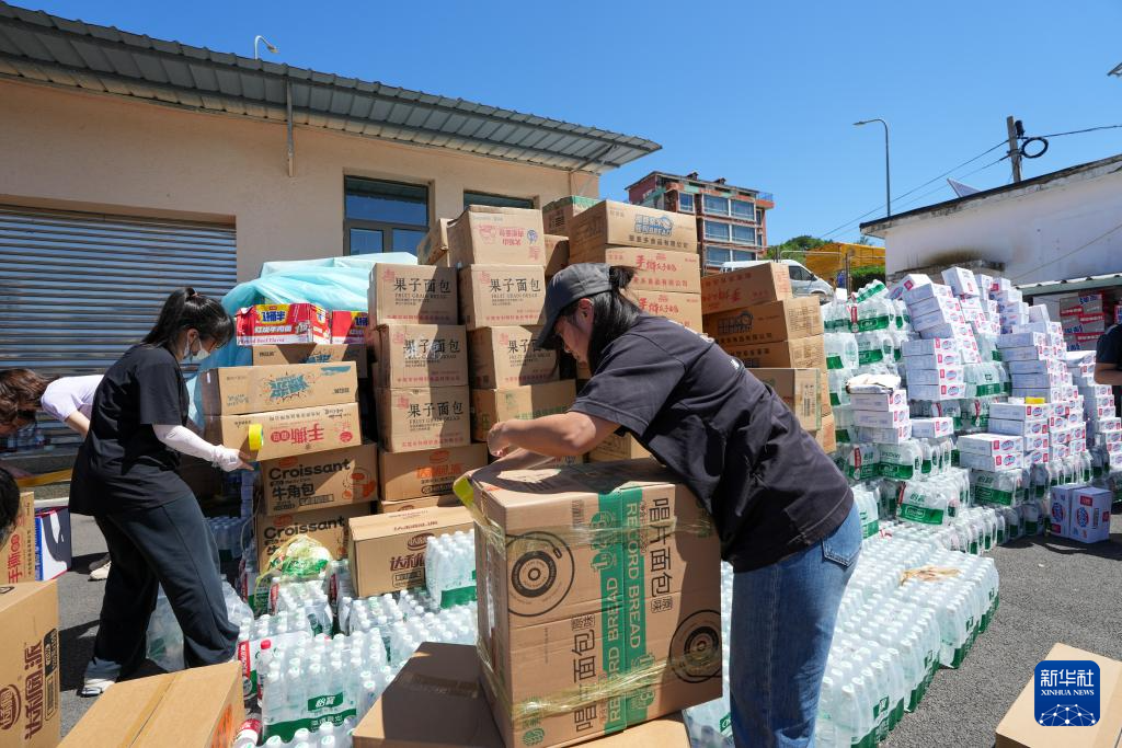 7月30日,在密云区冯家峪镇西庄子村,工作人员打包生活物资,方便救援人员进行运送。