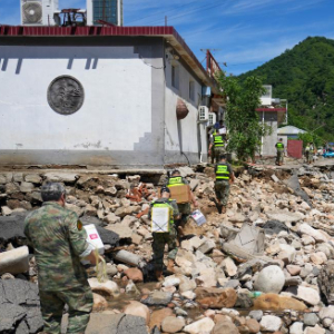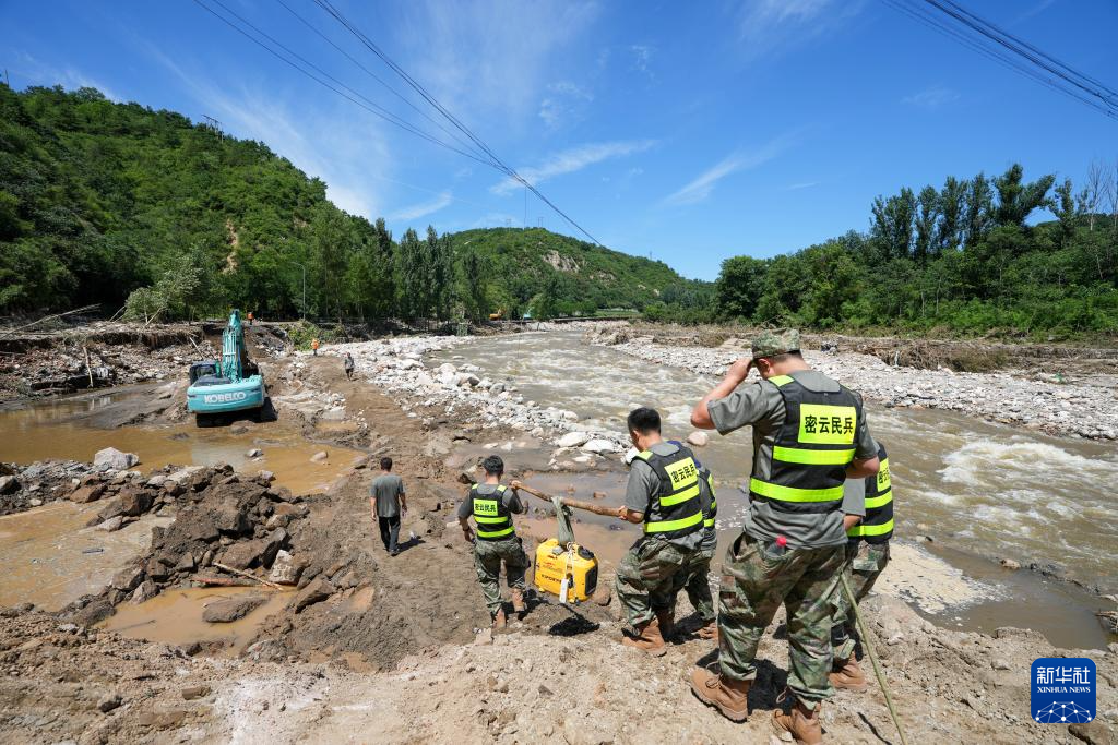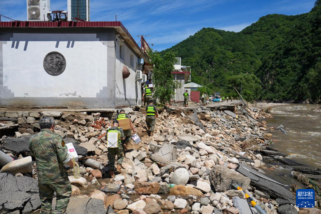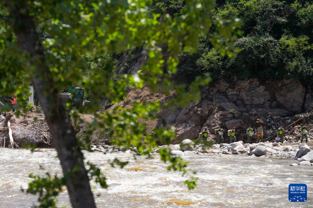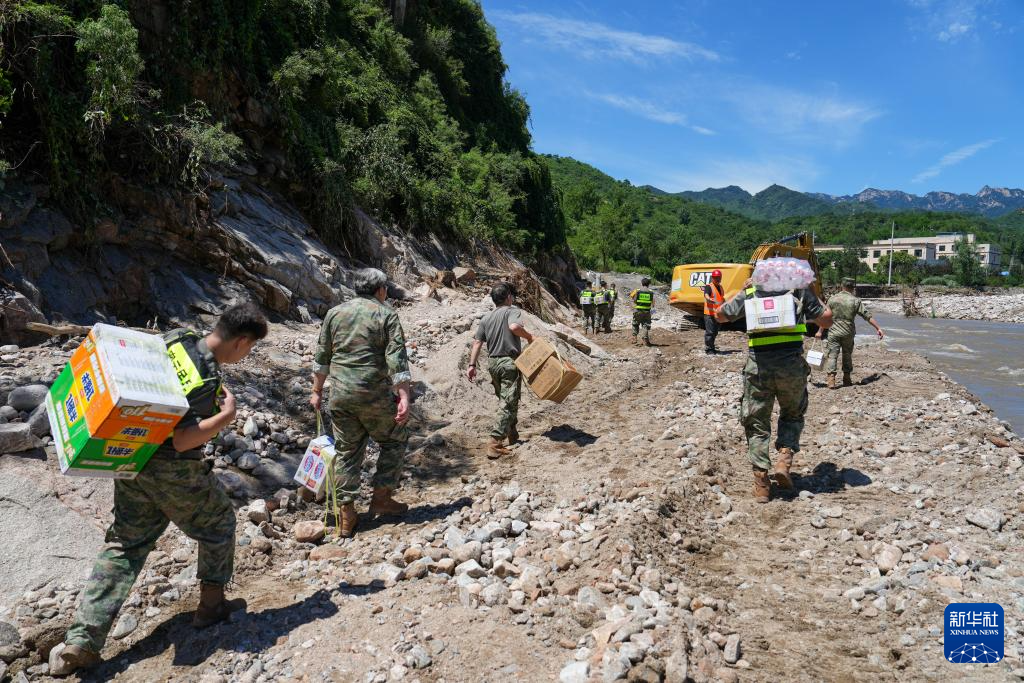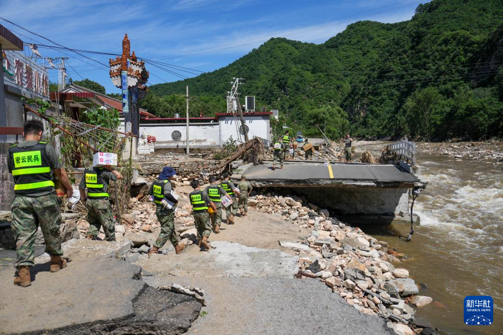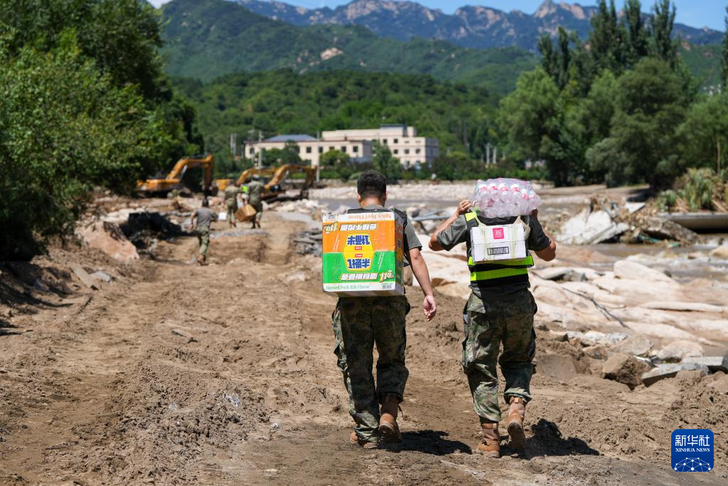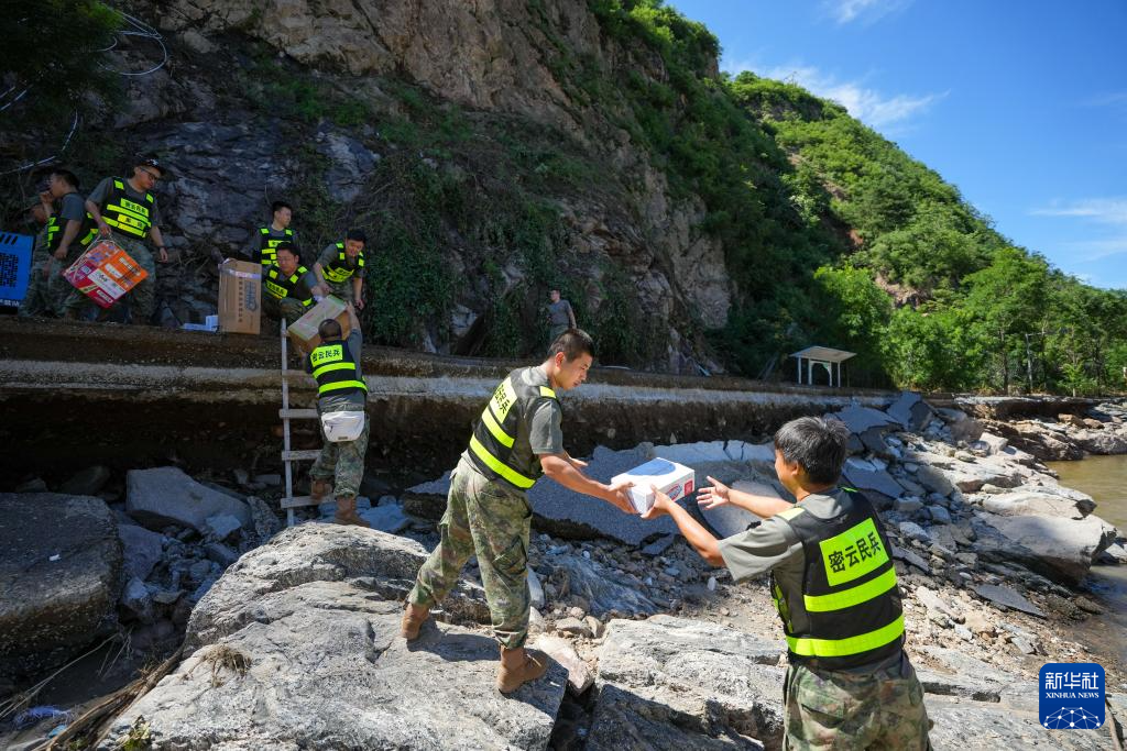 7月30日,在密云区冯家峪镇,密云区消防救援支队的救援人员为道路被阻断的村庄运送物资。