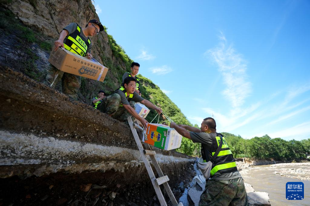 7月30日,在密云区冯家峪镇,密云区消防救援支队的救援人员为道路被阻断的村庄运送生活物资。