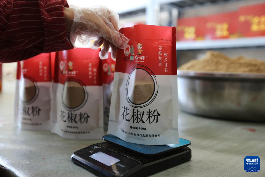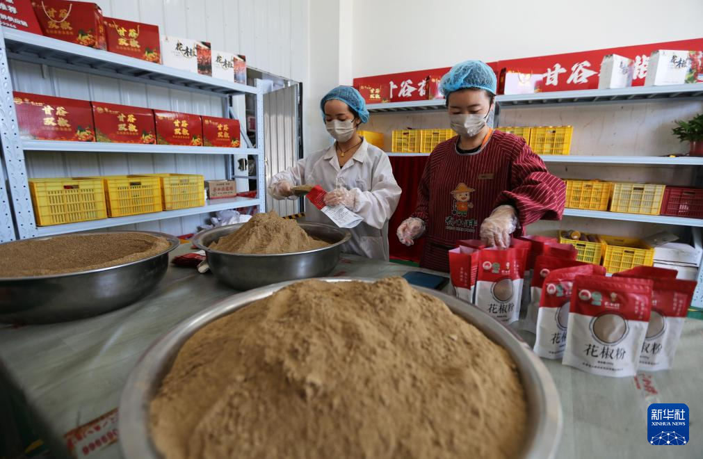 7月30日,工作人员在甘肃省天水市甘谷县甘谷花椒集散交易中心将花椒粉装袋。