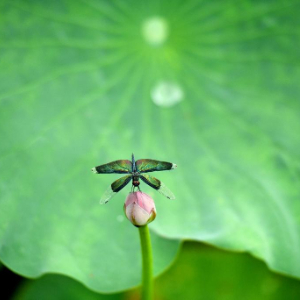 7月1日,在河北沧州狮城公园,一只蜻蜓停留在荷花花苞上。