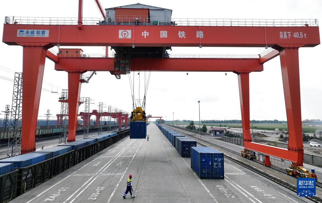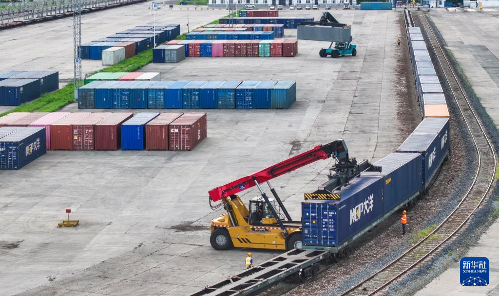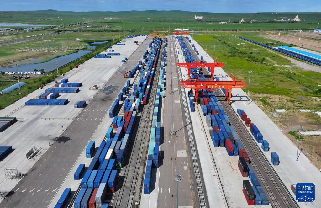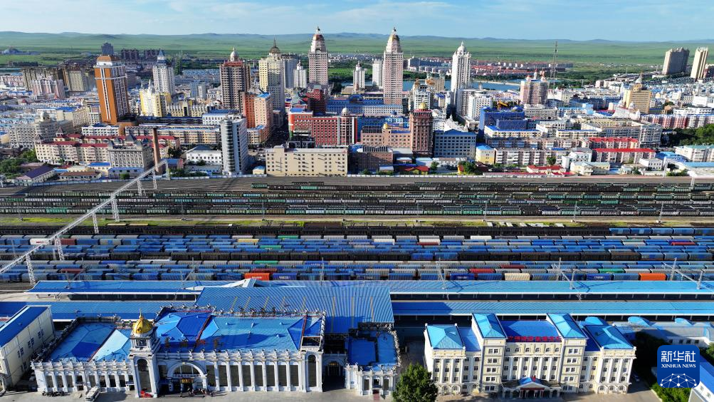 7月31日,一列满载货物的回程中欧班列在中国铁路哈尔滨局集团有限公司满洲里站集装箱场进行换装作业(无人机照片)。