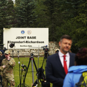 8月14日,媒体记者的摄像机架设在美国阿拉斯加州安克雷奇的埃尔门多夫-理查森联合军事基地外。