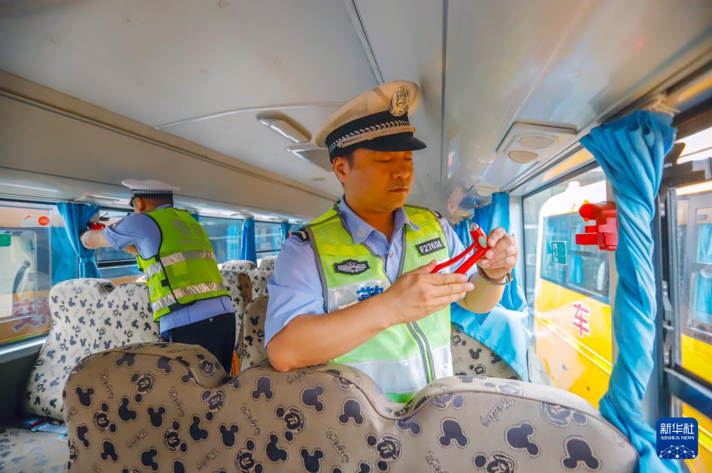 8月22日,湖北省武汉市武昌区交通大队民警对校车进行安全检查。