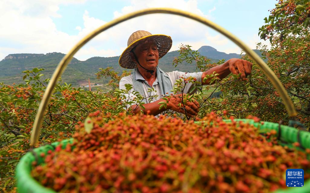 8月23日,山东省枣庄市山亭区山城街道农民在田间收获花椒。