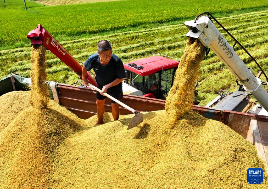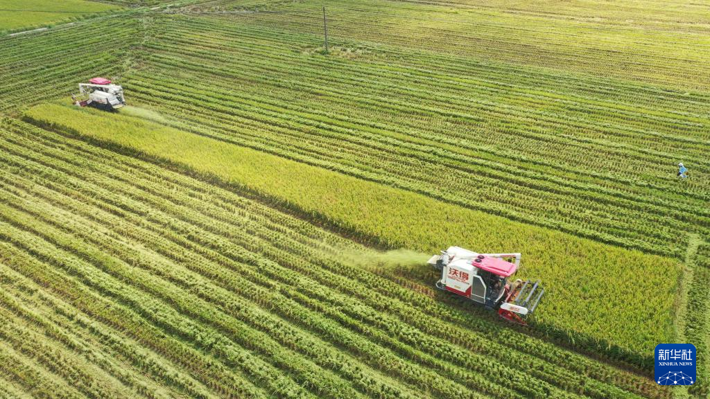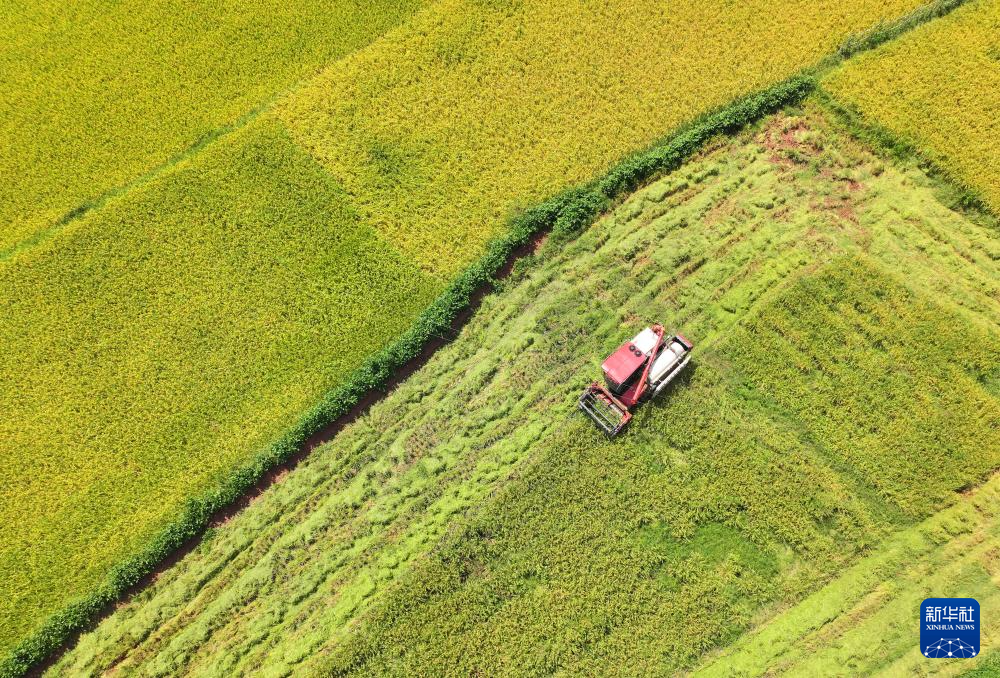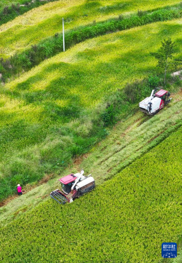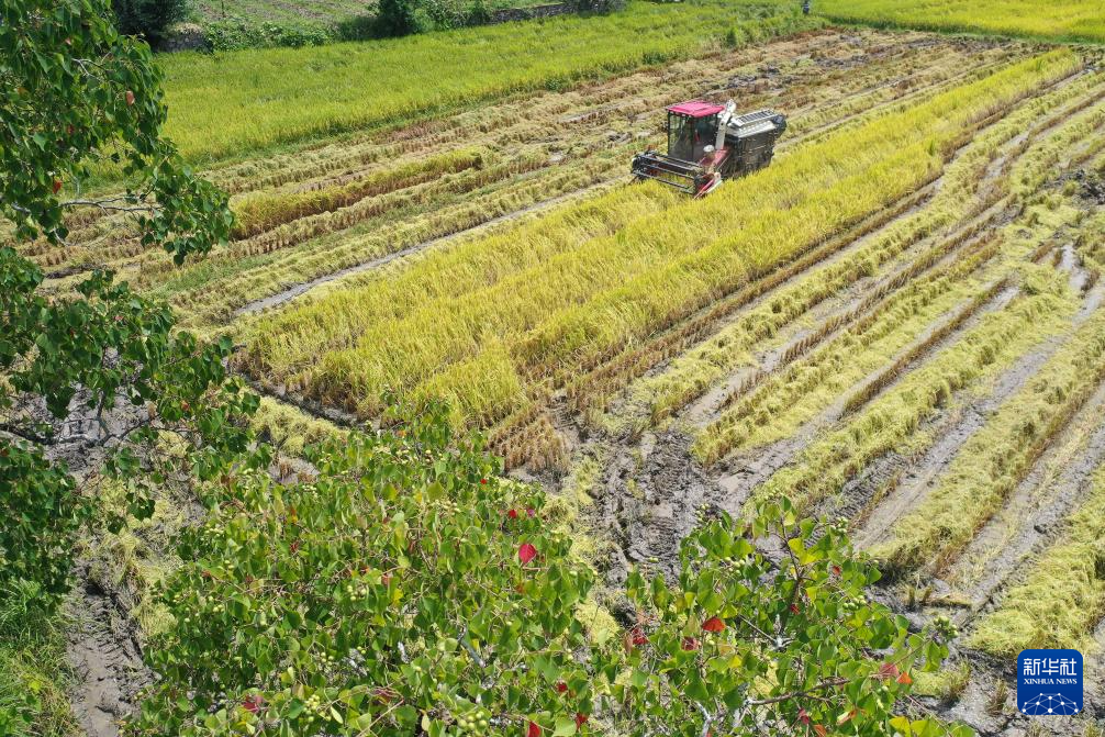 8月23日,农民驾驶收割机在湖南省湘西土家族苗族自治州龙山县石羔街道收割水稻(无人机照片)。