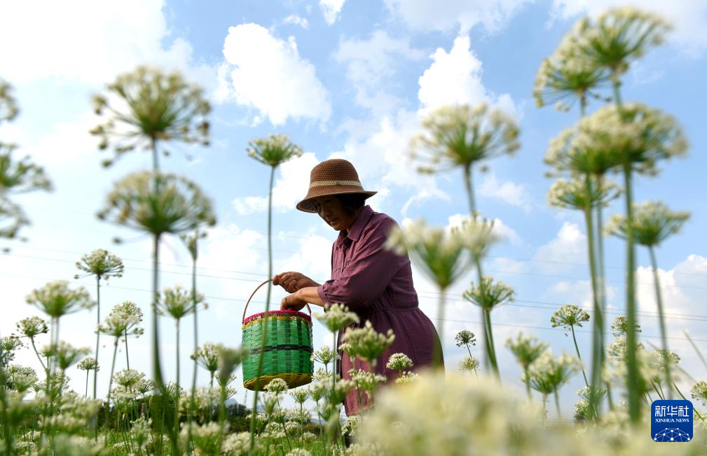 8月23日,在山东省淄博市沂源县悦庄镇朱家庄村,农民在采摘韭菜花。