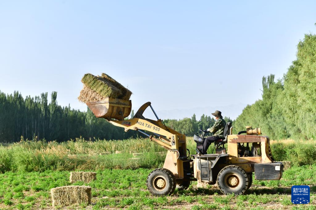 8月24日,在甘肃省阿克塞哈萨克族自治县红柳湾镇红柳湾村,农民在田间回收成捆的苜蓿草。