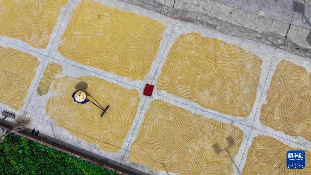 8月24日,在湖南省常宁市洋泉镇,农民在晾晒稻谷(无人机照片)。