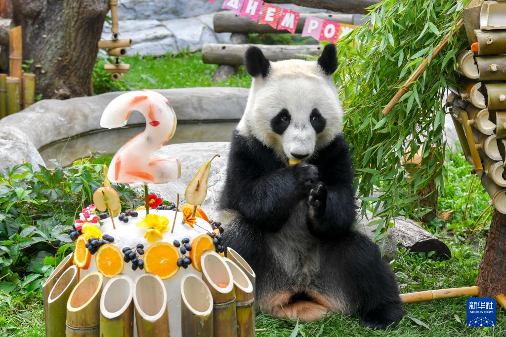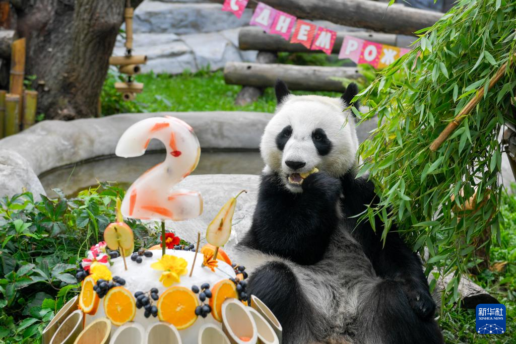 8月24日,大熊猫“喀秋莎”在俄罗斯莫斯科动物园享用“生日蛋糕”。