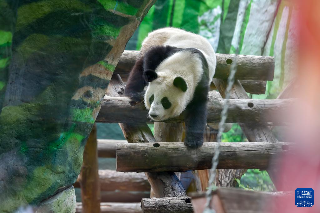 8月24日,大熊猫“喀秋莎”在俄罗斯莫斯科动物园玩耍。