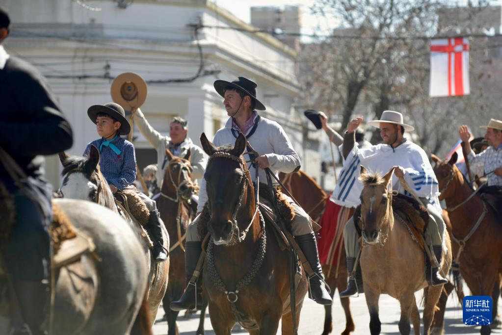 8月25日,民众身着传统服饰在乌拉圭南部城市佛罗里达参加乌拉圭宣告独立200周年纪念活动。