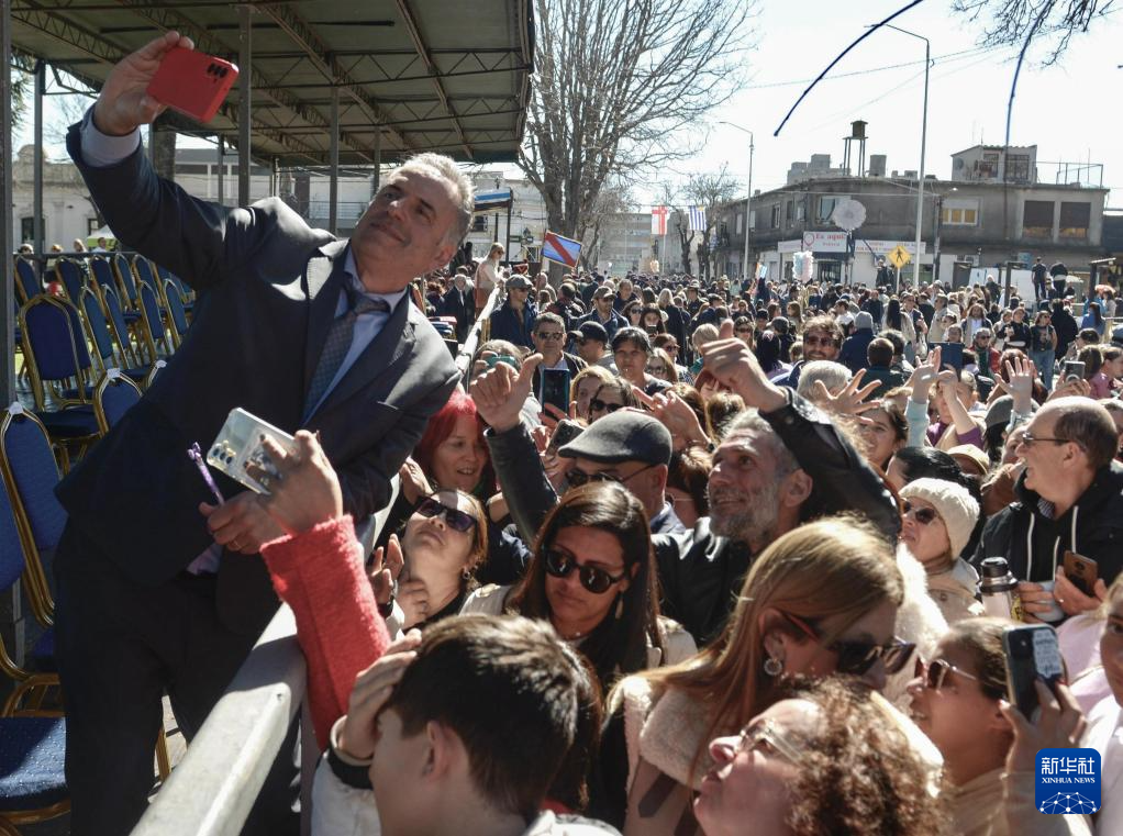 8月25日,乌拉圭总统奥尔西(左)在乌拉圭南部城市佛罗里达举行的乌拉圭宣告独立200周年纪念活动上与民众自拍合影。